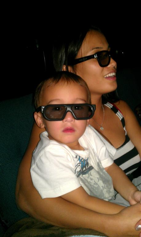 Hey, my son loved the smurfs, though all I could think about was getting one of my rifles out and shooting the little bastards, didn't bother with Conan because we're smarter than that, and we're still going to see the Apollo movie, even though it sucks, because I like science fiction no matter how bad it is. And as for movies, we just saw Shark 3D, which the little guy loved, and which the wife also enjoyed. Talk about a fine piece of movie making! But if you're bored, you should try to find The Debt, which was a pretty damn good movie, until the end when the octogenarians were in a fist fight. Nothing like senile MMA. Oh, I included a picture of the little guy at the movies below. Guess how I took that shot with the flash on? It was easy, we were the only ones there.