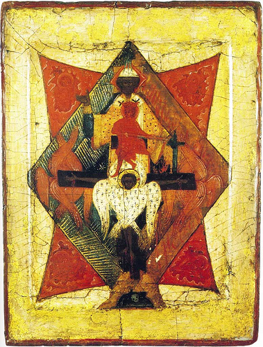 The surrounding blazing fire symbolizes his activity that consumes neurotic states.