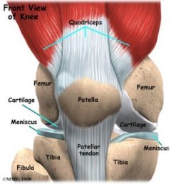You have to think of the knee as two bones, the femur (thigh bone) and the tibia (leg or calf bone, hereby referred to as the "leg"), one standing on top of the other. That is, end to end, one on top of the other, constantly rubbing and grinding together. Think of holding your two closed fists together in front of you, knuckles to knuckles. Now, just bend your arms so that your fingers roll on each other, as the palms come together. That's bending your knee, in simplistic terms. But the important thing to get from this analogy, is the fact that the bones do not really provide any sort of structural integrity to the joint. The joint is basically made up of one bone resting on top of another. A few things hold it all together.
