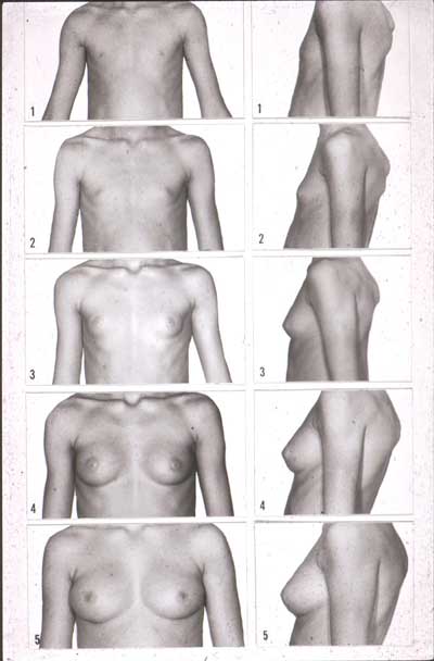 Let's talk about breast development. There was a gentleman named Tanner, who, for whatever reason, studied the sexual advancement of British white girls. I guess watching a little girls breasts grow is something you English guys seem to get into. Anyway, he found that girls seem to progress in fairly similar manners. We'll just concentrate on the breasts, as this is a family web site, we'll leave the genitalia out of the discussion.