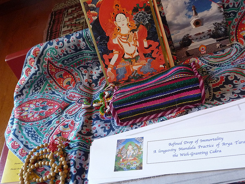 The rosary symbolizes his continuous activity for the benefit of beings.