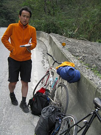 anyhow, here's some japanese guy biking around taiwan on the most ridiculous bike ever. it's hilarious. i couldn't believe he was on that thing. he speaks practically no chinese, very very little english, and i don't know any japanese. we're both thinking we're going to make it to these far away places that day, deliriously, yet we're both wrong.