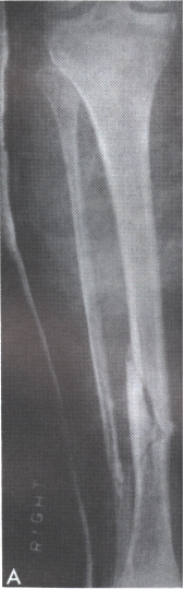 The accompanying picture demonstrates the size difference between the upper and lower tibia, and also shows a fracture of the lower tibia.