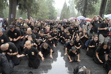 At 09:20, accompany with American kungfu masters, shaolin disciples Yandi and Yan Deng, shiyongxin, the abbot of shaolin temple,walked in a leisurely out of the gate, and all 500 American disciples kowtow to yongxin by China Buhhda ceremoney.