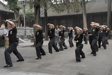 Early in the morning, all guys weraing black kungfu uniforms, with the sign of "shaolin boxing Fa" in Chinese ,wait in the square in front of Moutain Gate of the shaolin temple, requesting the pleasure of yong xin 's company.They are from 30 different states of US,the yongest one is only 5 years old, while the oldest one is 62 years old.